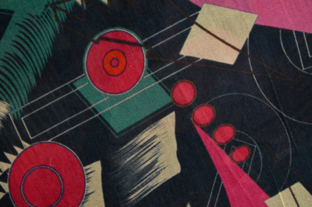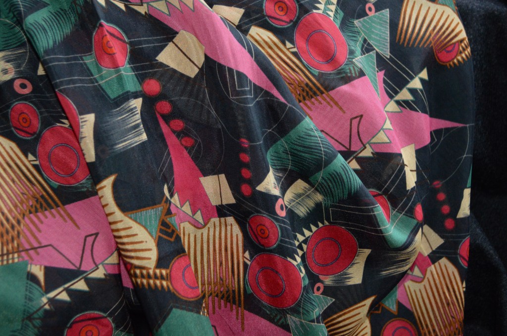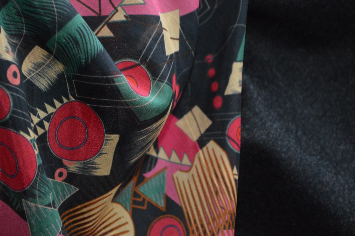 • 100% soie à l’imprimé multicolore abstrait sur fond noir. Collection Maison française. Idéal blouse. Largeur: 140 cm. Coupe de 1,5 m.