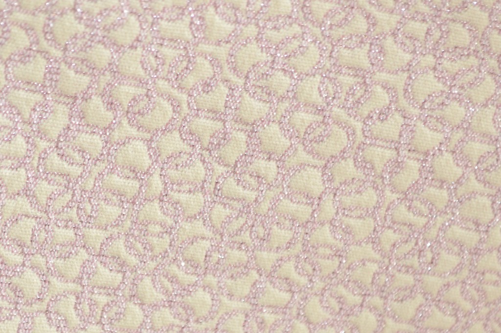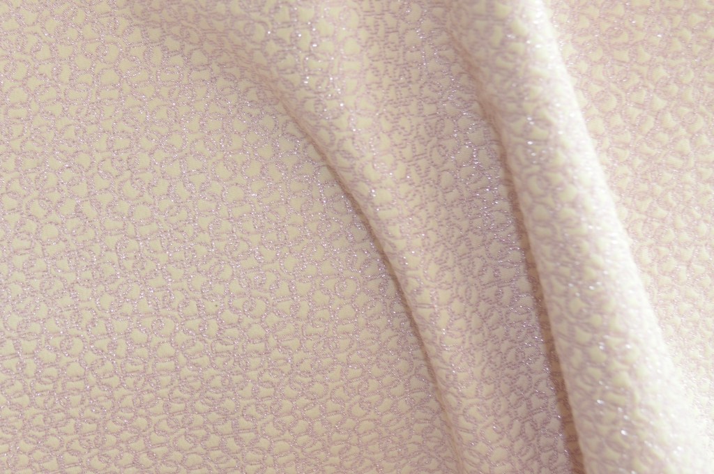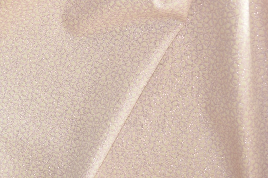 Coup de coeur pour ravissant jacquard. Collection Maison de Couture italienne. Imprimé géométrie rose champagne élégamment scintillant sur fond ivoire. 75% coton, 23% polyester, 2% fils métal. Idéal robe, veste, jupe, top, ensemble. Largeur: 150 cm.