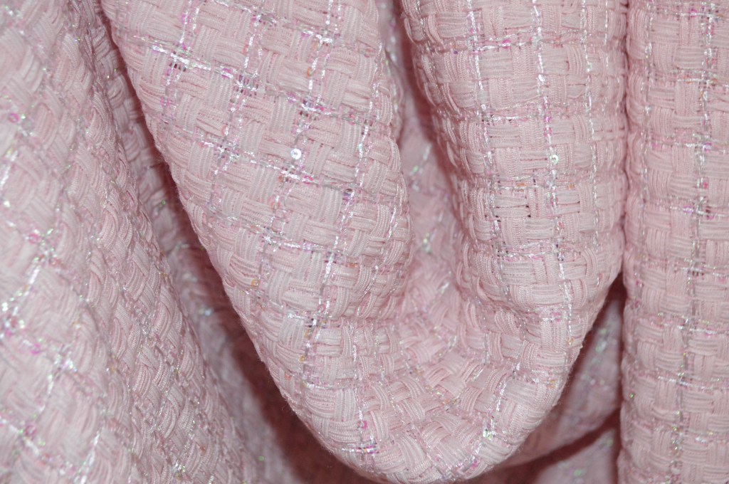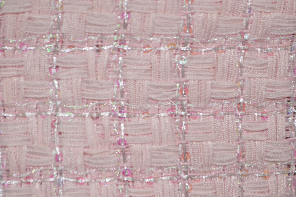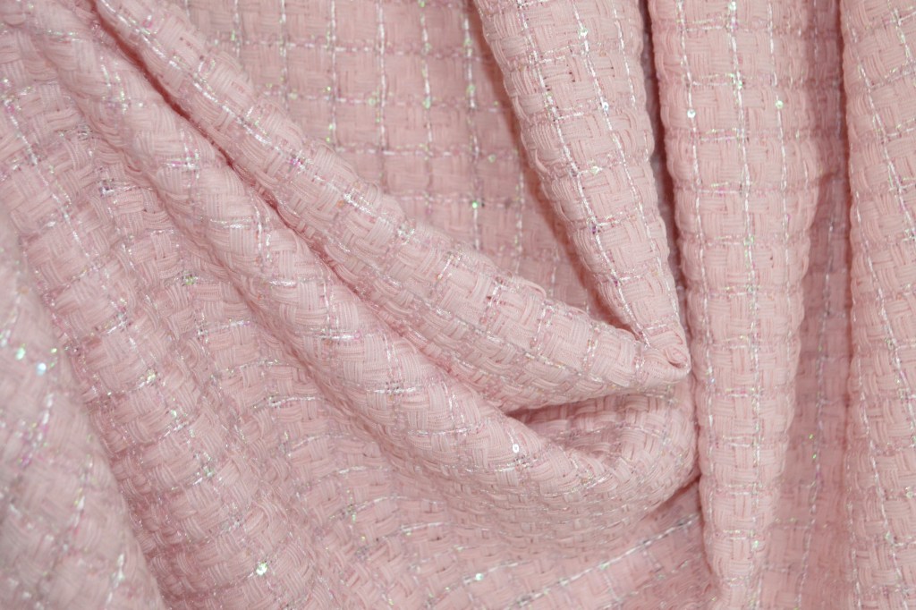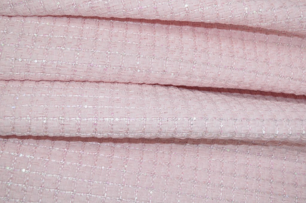 Sélection Prestige. Coup de coeur pour ce ravissant natté aux sequins discrets dans un rose doux. Collection Maison française. 30% soie, 40% viscose, 20% sequins, 10% polyester. Idéal veste, robe. Largeur: 146 cm.