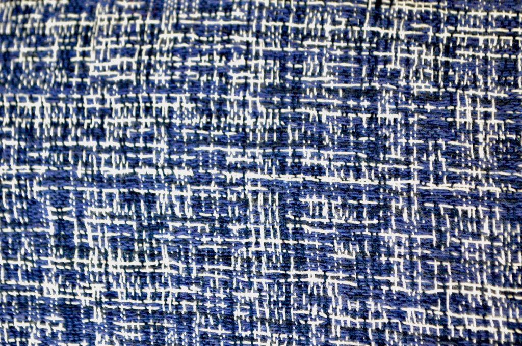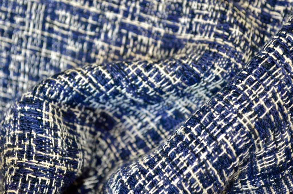 Sélection Prestige. Superbe natté souple Navy et blanc. Une belle valeur sûre. Collection Maison italienne. 70% coton, 30% viscose. 190 gr / m². Idéal veste, robe, ensemble. Largeur: 147 cm.