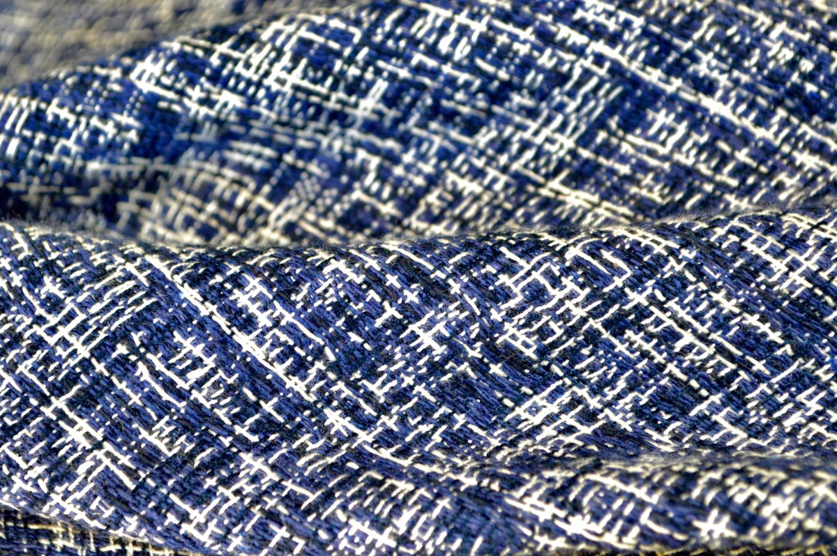Sélection Prestige. Superbe natté souple Navy et blanc. Une belle valeur sûre. Collection Maison italienne. 70% coton, 30% viscose. 190 gr / m². Idéal veste, robe, ensemble. Largeur: 147 cm.